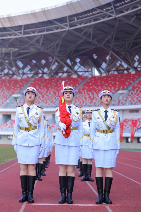 升旗展示,她们规范流畅,齐步正步转换行云流水,精准卡点,将五星红旗徐徐升起。每一各细节都彰显着日复一日的刻苦训练与对护旗使命的坚守。那一抹鲜艳的中国红,早已成为她们青春中最耀眼的颜色!
