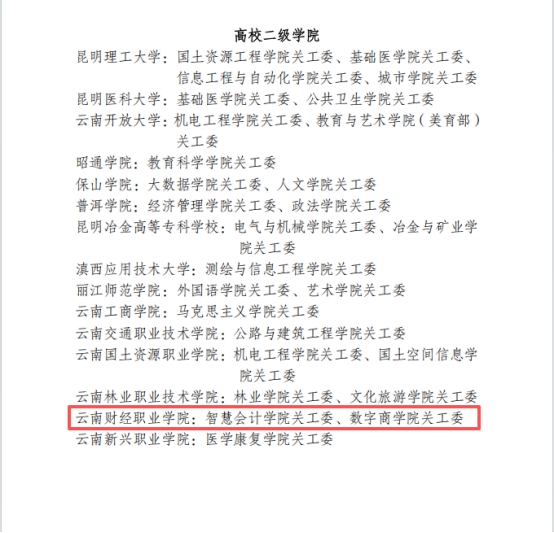近日,云南省教育厅关心下一代工作委员会发布《关于2025年度全省教育系统基层“五好”关工委认定情况的通报》,经自主申报、层层审核、省级审议等严格程序,我校智慧会计学院关工委、数字商学院关工委成功获评2025年度云南省教育系统基层“五好”关工委荣誉称号。