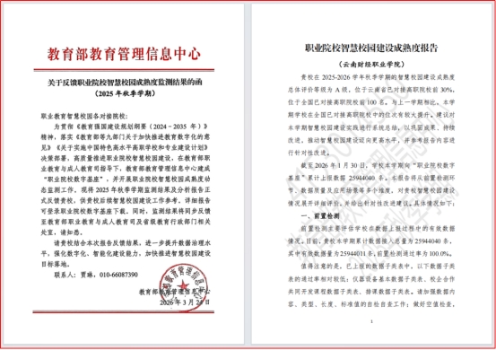 近日,教育部教育管理信息中心发布《2025—2026学年秋季学期职业院校智慧校园成熟度报告》,云南财经职业学院智慧校园建设成熟度总体评价等级首次获评A级,是云南省仅有的4所获此评级的院校之一,在全国已对接高职院校中排名从前200名跃升至前100名,标志着学校数字化转型与智慧校园建设迈上新台阶,跻身全国职业院校智慧校园标杆校建设第一梯队。