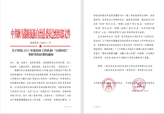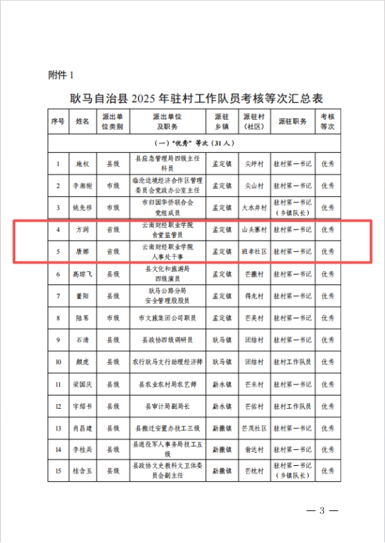 近日,中共耿马傣族佤族自治县委员会组织部发布2025年度驻村工作队和“自然村长”考核等次结果,我校选派的乡村振兴驻村工作队员方润、唐娜在2025年度考核中荣获“优秀”等次。