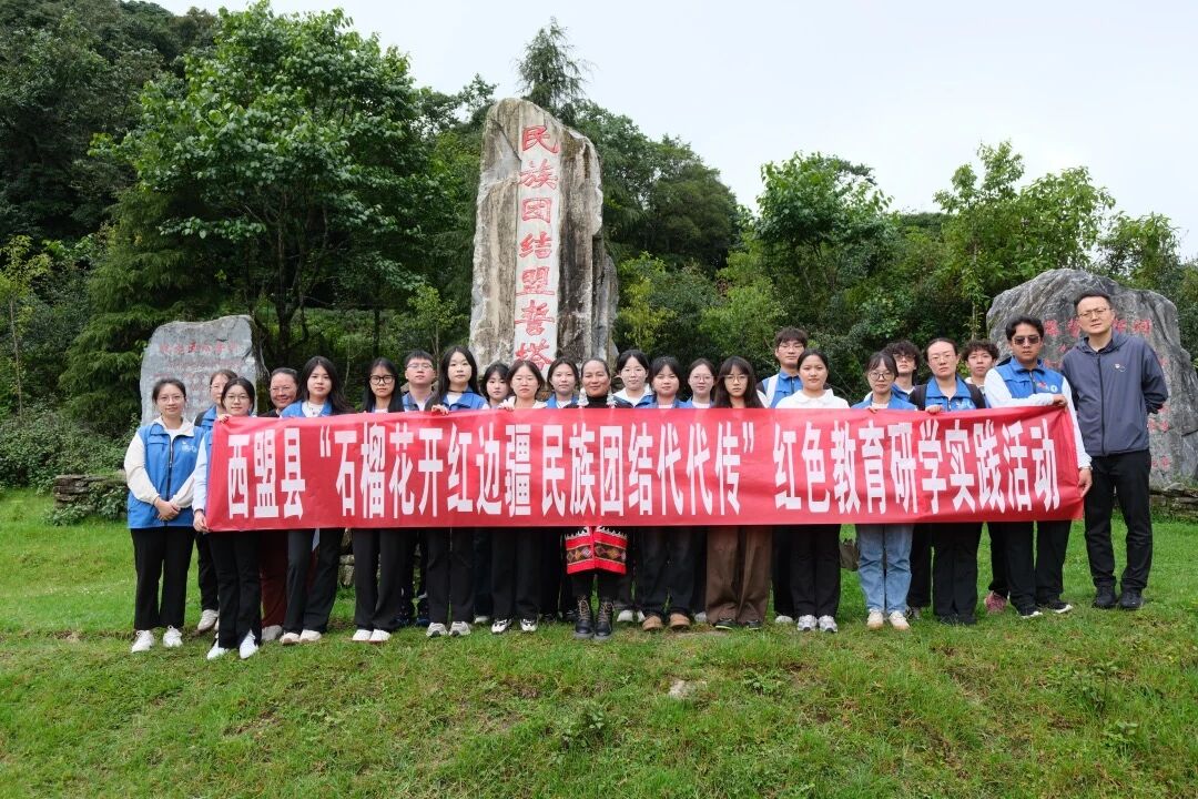 在革命烈士陵园,西盟县勐卡镇党委副书记江雪娇带领师生回顾了西盟地区革命历史,讲述先烈们为民族解放事业献身的感人事迹,师生们驻足革命烈士永垂不朽碑前,一起肃立默哀、擦拭碑尘。团西盟县委董秋异老师带领着大家在民族团结盟誓塔一同深入学习领会《习近平总书记给普洱民族团结誓词盟誓代表后代的回信》,期间,全体团员齐唱团歌,在团旗下重温入团誓词。在盟誓塔前马克思主义学院教师秦杨结合自身经历带领同学们上了一堂生动的团课。通过理论学习与实践教育深度融合,师生们通过实地走访、主题团课、仪式教育等形式,在革命旧址中接受精神洗礼,时刻铭记铸牢中华民族共同体意识是永恒课题!