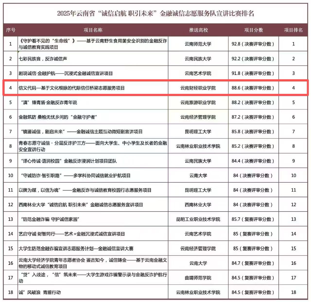近日,由共青团云南省委、国家金融监督管理局总局云南监管局主办,云南省志愿者协会协办“志愿彩云南 青春展风采”——2026年云南青年学雷锋志愿服务活动暨2025年云南省“诚信启航 职引未来”金融诚信志愿服务队宣讲比赛决赛在昆明成功举办。