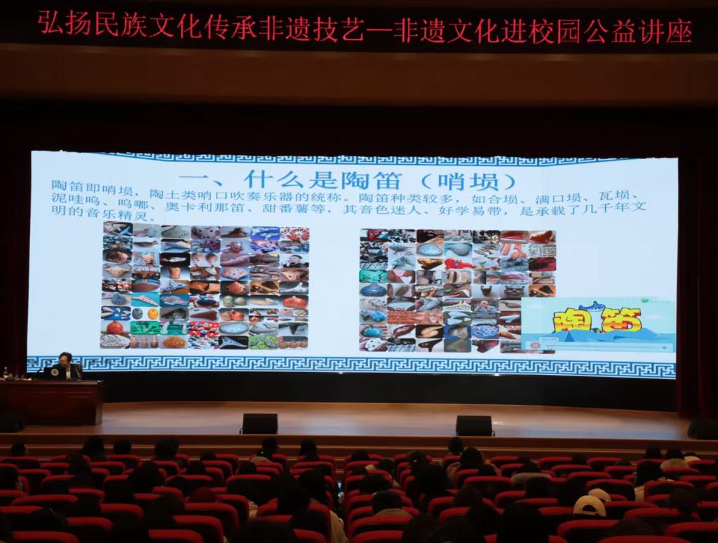 在讲座中,主讲人陈相吉老师结合自身数十年的技艺实践经验,围绕陶笛、哨埙两类民族乐器展开生动讲解。从古朴的历史典故到精湛的制作工序,从濒临失传的发展困境到如今的创新路径,让在场师生对非遗文化的历史底蕴和时代价值有了更加系统、深刻的认识。他强调,新时代的非遗传承,既要坚守文化根脉,又要主动拥抱现代科技和传播方式,在守正创新中增强中华文化的影响力和感召力,这正是新时代文化自信的生动体现。