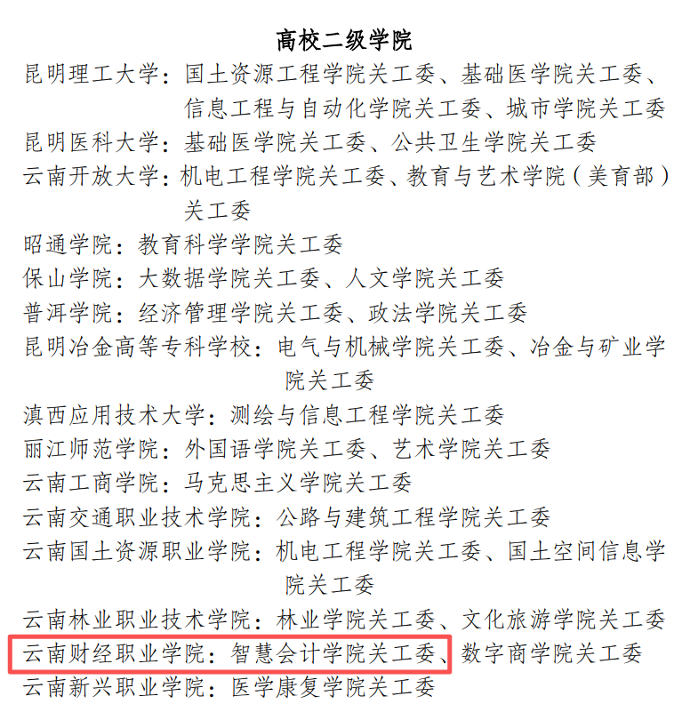近日,云南省教育厅关心下一代工作委员会发布《关于2025年度全省教育系统基层“五好”关工委认定情况的通报》,云南财经职业学院智慧会计学院关工委成功获评2025年度云南省教育系统基层“五好”关工委荣誉称号,成为全省27个获此殊荣的高校二级学院关工委之一。