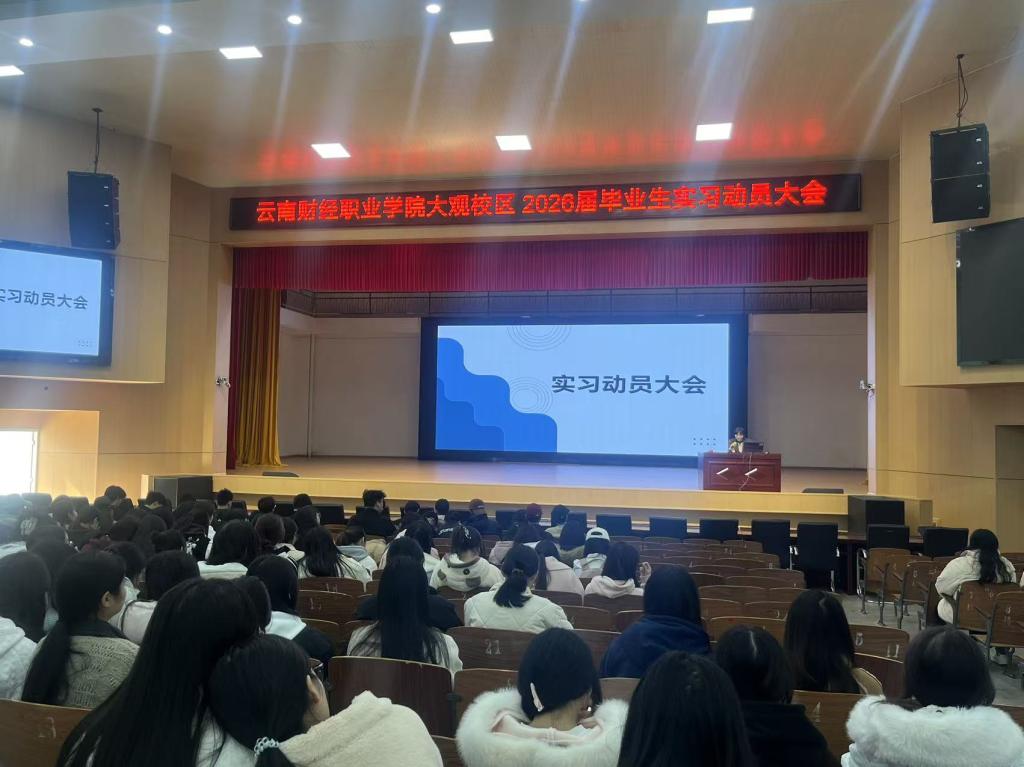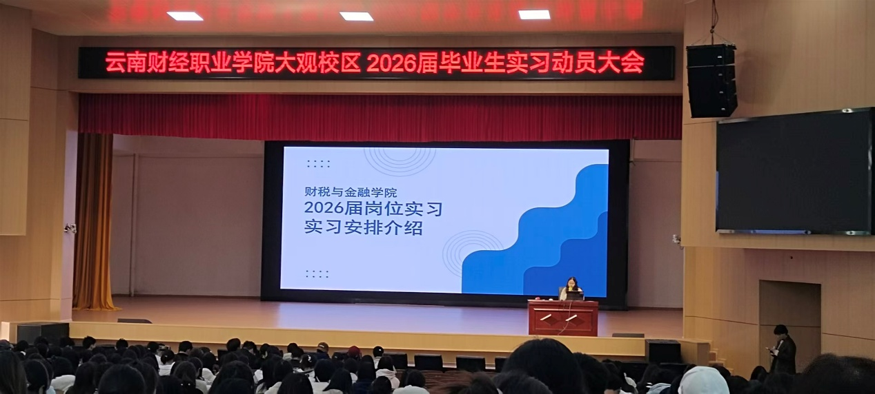 为深入贯彻落实国家及云南省关于职业院校学生实习管理的相关政策,推动实习工作规范、有序开展,2025年12月9日中午12:30至13:30,财税与金融学院在云南财经职业学院(大观校区)大礼堂组织召开2026届岗位实习动员大会。学院院长、相关领导、毕业班辅导员、班主任、实习管理老师及学院2023级全体毕业生共同参会。会议旨在明确实习任务、强调实习纪律、保障实习质量,为即将步入实习岗位的学生做好思想动员与政策解读。