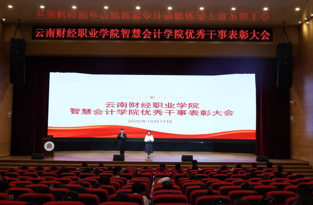 2025年10月19日,云南财经职业学院智慧会计学院2024-2025学年团学工作表彰大会在学院大礼堂隆重召开。本次大会以习近平新时代中国特色社会主义思想为指导,深入学习贯彻党的二十大精神及团十九大部署要求。学院党支部副书记、团总支书记及全体学生代表共同出席,见证先进集体与个人的荣光,凝聚青年学子坚定不移听党话、跟党走的奋进力量。