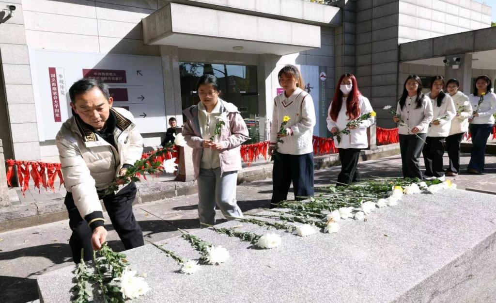 在烈士墓前的广场上,智慧会计学院党支部书记郁军带领全体党员重温入党誓词,以铿锵有力的誓言表达传承革命精神、践行初心使命的坚定决心。随后,党支部全体党员及入党积极分子代表向烈士墓敬献鲜花,师生肃立默哀,表达对革命先烈的深切缅怀与崇高敬意。