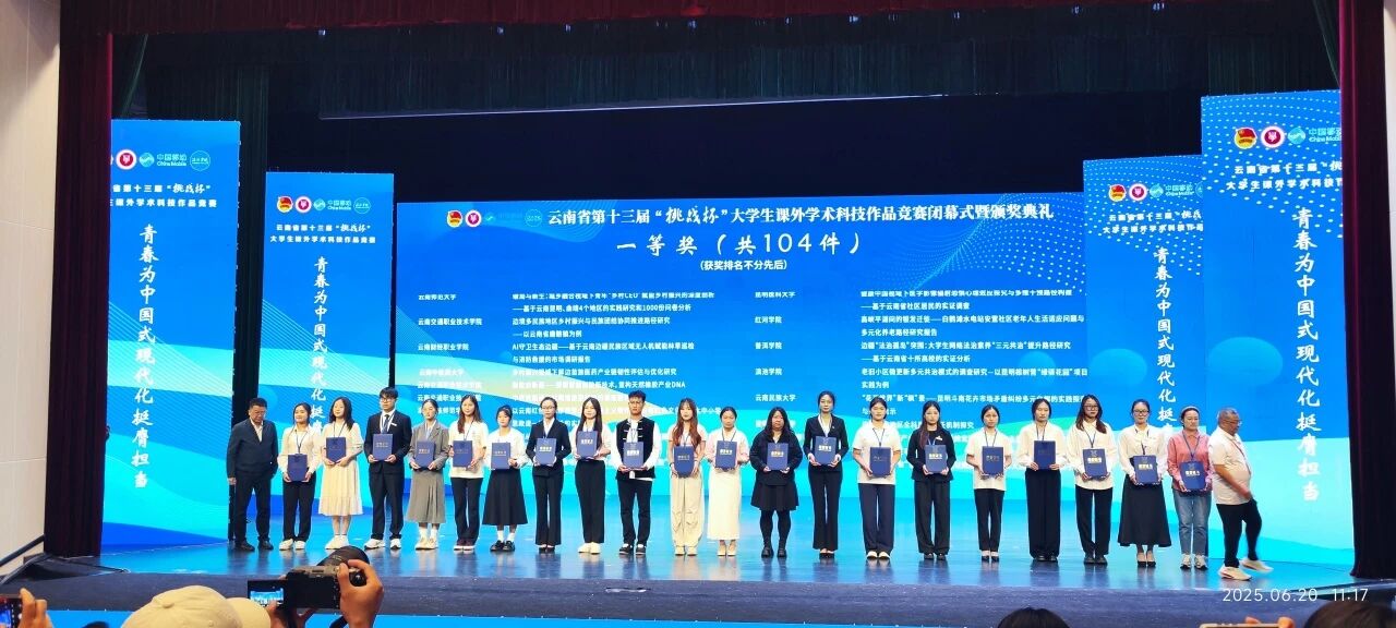 6月20日,由共青团云南省委、中共云南省委教育工委、云南省科学技术协会、云南省社会科学院、中国科学院昆明分院、云南省学生联合会举办的云南省第十三届“挑战杯”大学生课外学术科技作品竞赛省级决赛,在滇池学院(杨林校区)落下帷幕。我校报名参赛12件作品,经过激烈角逐,共斩获一等奖1项、二等奖2项、三等奖7项,实现学校在此项赛事获奖等次和获奖数量的历史性突破!