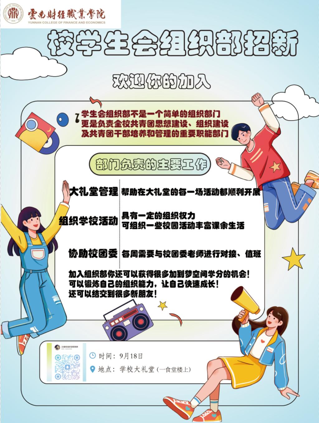 这里是秩序与温度的枢纽,是组织活力的发动机,更是青年成长的锻造场 —— 云南财经职业学院学生会组织部,诚邀心怀责任的你,共赴一场协作与成长的征程!