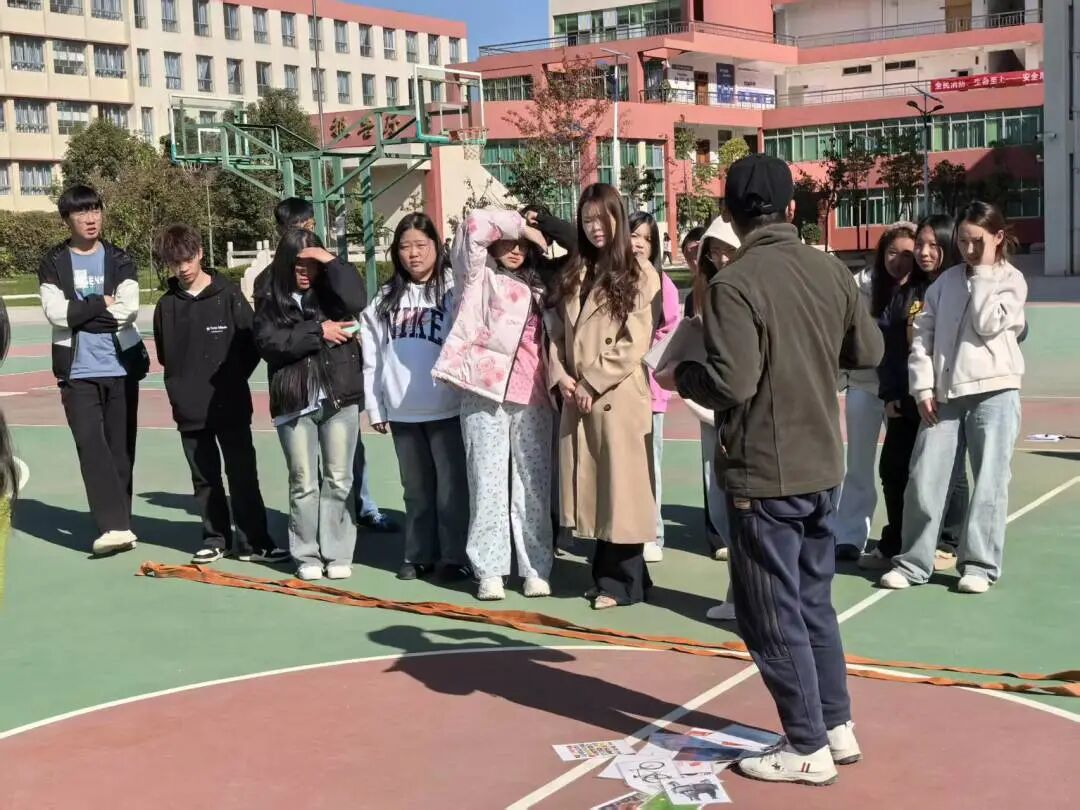 11月27日,大观校区明德广场上活力满满。“抓手指”“大风吹”点燃现场氛围,随机分组后的团队组建任务,让大家快速学会协作与表达;核心环节“极速60秒”中,智慧传承、合力筑塔、穿越雷区等七项任务,考验着每支队伍的沟通效率与团队默契;“信任背抛”环节更是将活动推向高潮,同学们在彼此的支撑与鼓励中,克服恐惧、建立深度信任,深刻体会到“沟通是心灵桥梁”的真谛。