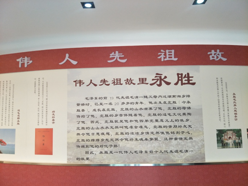 2020年8月2日,我们来到云南丽江永胜县程海镇凤羽村委会的毛家湾,参观学习毛氏宗祠、边屯文化和中原文化进入云南的历史。毛氏宗族,他们与韶山的毛家同宗同源,这里是韶山和永胜毛氏的发祥地。毛太华是湖南韶山毛氏和云南永胜毛氏的共同祖先。1997年,毛泽东的女儿李讷到永胜寻根,进一步认同了这一点。