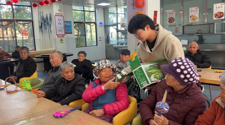 随后,大家围坐一起开展击鼓传花游戏。音乐响起,花朵在老人们和同学们手中传递;音乐停下,幸运的长辈或同学大方展示才艺——有的唱起老歌,有的讲起往事,有的送上祝福。现场掌声不断、笑声连连,福利院处处洋溢着轻松愉悦的氛围。