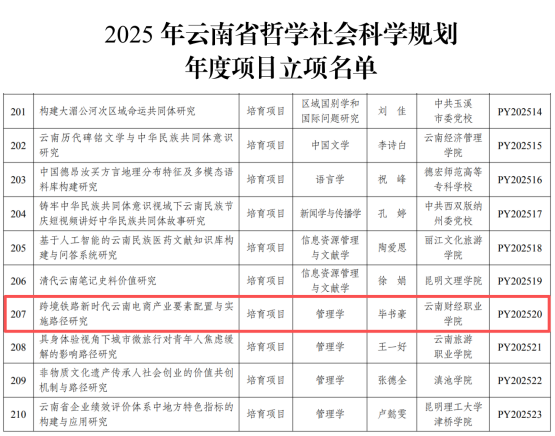 2025年6月11日,中共云南省委宣传部办公室发布《关于下达2025年云南省哲学社会科学规划年度项目立项名单的通知》,我校教师毕书豪作为负责人申报的《跨境铁路新时代云南电商产业要素配置与实施路径研究》项目成功获批立项。该项目聚焦中老铁路开通带来的区域经济发展新机遇,深入探索云南跨境电商产业要素优化配置与实施路径,为服务“一带一路”建设和云南高质量跨越式发展提供智力支持,是我校贯彻落实二十届历次全会精神、服务国家战略与边疆发展的具体体现。