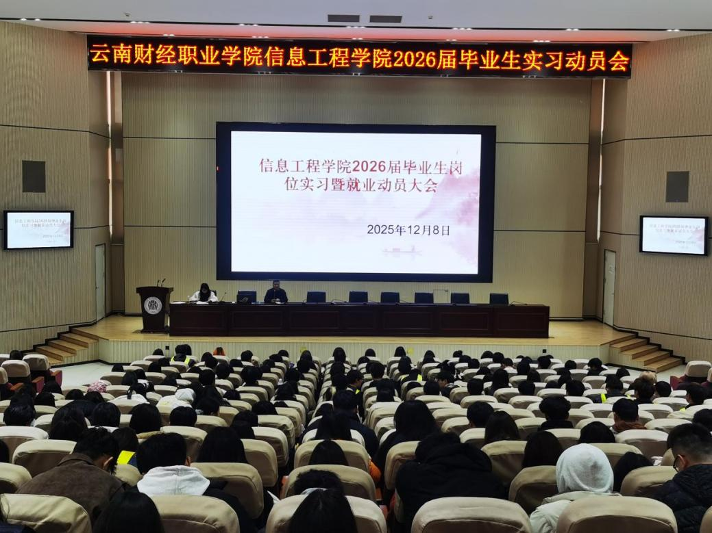 为帮助2026届毕业生明确实习要求、理清就业方向、把握升学机遇,切实搭建校园与社会的衔接桥梁,根据教育部等八部门关于印发《职业学校实习管理规定》《职业学校学生实习管理规定》《云南省教育厅等八部门关于印发云南省职业学校学生实习管理工作方案的通知》《云南省教育厅关于印发云南省职业院校学生实习管理实施细则》等文件要求,保证岗位实习与就业工作顺利推进,2025年12月8日,信息工程学院分别在龙泉校区铭德楼报告厅和大观校区报告厅召开2026届毕业生岗位实习暨就业动员大会。学院班子成员、实习专员、辅导员及全体2026届毕业生参会,会议由学院副书记周林莉主持。