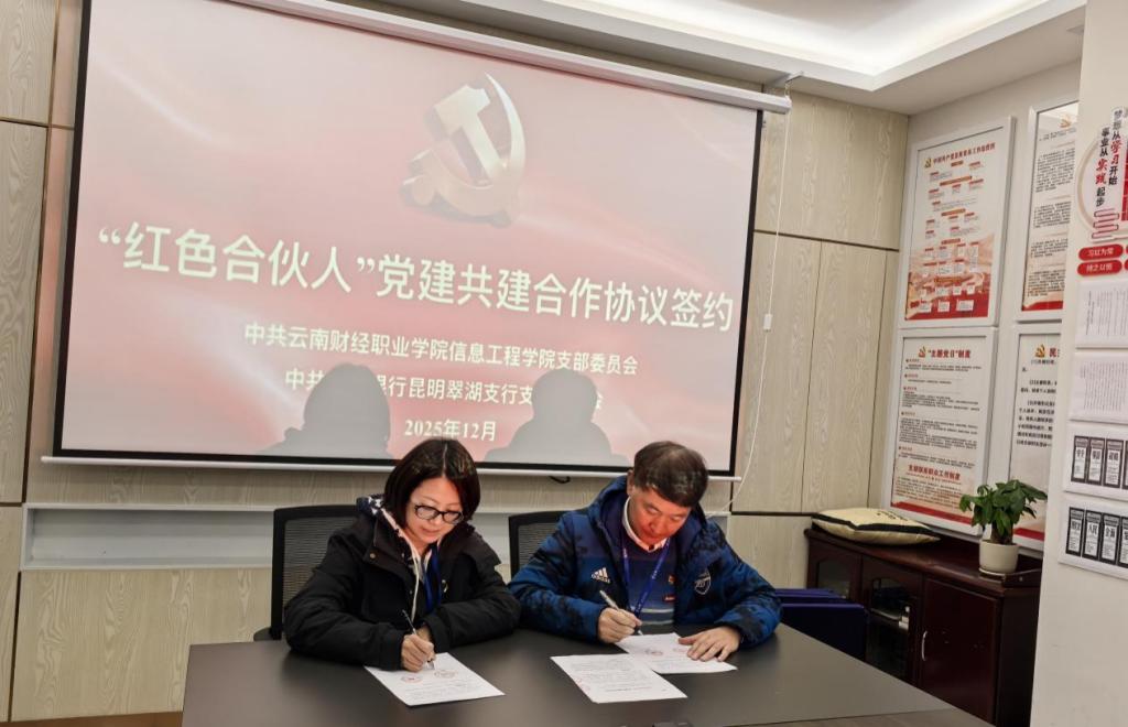 为深入学习贯彻党的二十大精神,扎实落实新时代党的建设总要求,进一步深化银校党建融合与资源共享,12月24日,云南财经职业学院信息工程学院党支部与兴业银行昆明翠湖支行党支部举行“红色合伙人”党建共建合作协议签约仪式,以党建为纽带,搭建起银校协同发展的新平台。