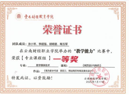 在学校层面的比赛中,由信息工程学院教师组成的第一团队,凭借《网页设计与制作》课程作品《我为家乡代言 项目三:网站网页布局及美化设计》脱颖而出,一举夺得专业课程组一等奖。该作品以“我为家乡代言”为主题,聚焦网站网页布局及美化设计核心技能,将地域文化元素与专业教学深度融合,既注重学生实操能力的培养,又融入了家国情怀教育,教学设计新颖、逻辑清晰,得到了评委的一致好评。