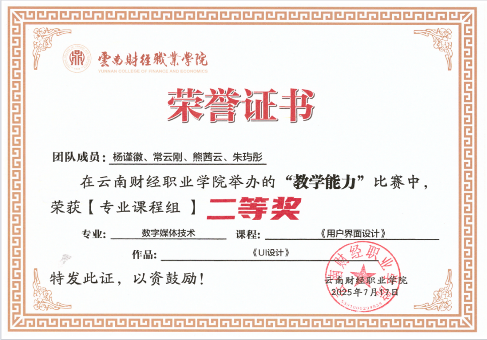 另一支参赛团队则以《用户界面设计》课程作品《UI设计》参赛,凭借严谨的教学流程设计、丰富的教学方法运用以及对学生职业能力的精准把控,荣获专业课程组二等奖。该作品紧密结合行业发展趋势,围绕UI设计核心知识点展开教学设计,注重培养学生的设计思维和创新能力,展现了团队深厚的教学积累。
