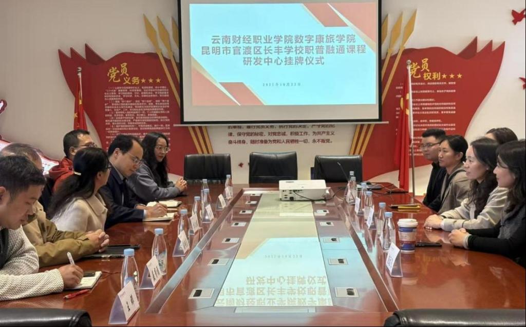 最后,在长丰中学双方共同举行“云南财经职业学院数字康旅学院 昆明市官渡区长丰学校职普融通课程研发中心”挂牌仪式。此次挂牌标志着校企在职普融通、课程研发、人才共育领域的合作迈入新阶段,将进一步推动学校教育资源与企业实践资源深度整合,为学生搭建更广阔的成长平台。