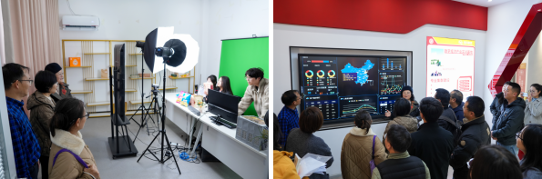活动正式开始前,五个支部的党员代表一起参观了学校协同创新虚拟仿真实训基地,观看学院学生的专业直播。滇中城投公司的党员同志对学院在跨境电子商务、网络营销与直播电商等专业的教学设施、实训条件及教育教学工作和人才培养工作给予了高度评价。