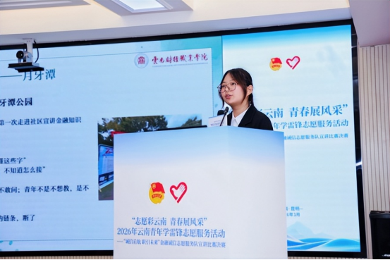 近日,由共青团云南省委、国家金融监督管理局总局云南监管局主办,云南省志愿者协会协办“志愿彩云南 青春展风采”——2026年云南青年学雷锋志愿服务活动暨2025年云南省“诚信启航 职引未来”金融诚信志愿服务队宣讲比赛决赛在昆明成功举办。云南财经职业学院财税与金融学院杨娅妮老师团队指导的《信义代码——基于文化根脉的代际信任桥梁志愿服务项目》脱颖而出,晋级决赛,并荣获全省第四名(银奖)、高职院校排名第一的优异成绩。