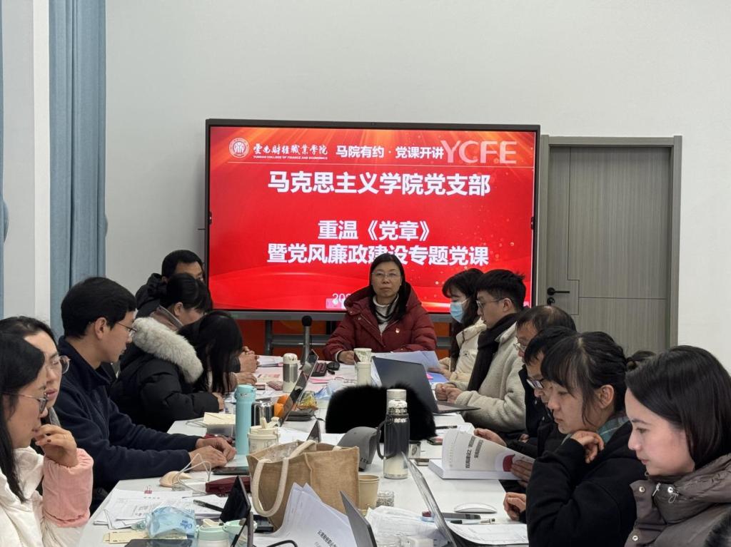 为深入推进全面从严治党,强化党员干部纪律规矩意识,营造风清气正的政治生态,2026年1月9日下午,马克思主义学院党支部开展“马院有约 马上学习”主题党日暨重温《党章》党风廉政专题党课活动,党支部书记主持活动,支部全体党员和思政课教师参加活动。