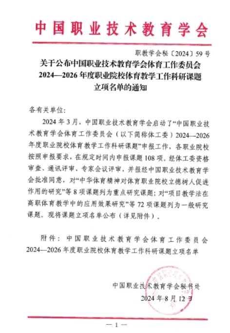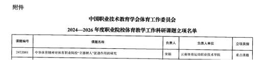 近日中国职业技术教育学会公布体育工作委员会2024-2026年度职业院校体育教学工作科研课题立项名单,云南财经职业学院马克思主义学院参与申报的课题《中华体育精神对体育职业院校“立德树人”促进作用的研究》获批重点项目立项。