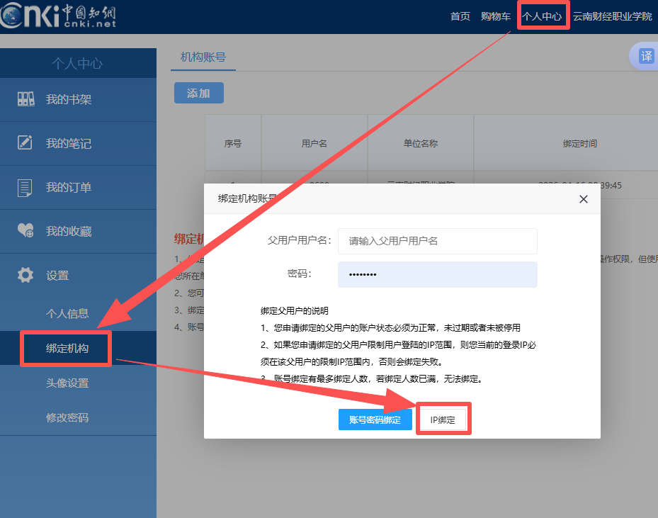 1.校内免登录使用;在学校IP内注册登录知网账号,并在“个人中心—设置”绑定机构后,可在校外登录使用。